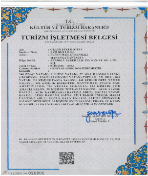 Kültür ve Turizm Bakanlığı tarafından otelimizde 03.Mayıs.2021 tarihinde yapılan inceleme ve sınıflandırma denetiminde kurumumuz, gerekli olan puanlamanın üstünde bir puan alarak 5.Yıldız almaya hak kazanmıştır. Ancak Bakanlık tarafından fiziki uygunluk kapsamında servis asansörü yapılması gerekli görülmüş işletmemize en kısa zamanda, 2000-3000 ve 4000 li bloklara olmak üzere dışarıdan servis asansörü yapılması işlemi ivedilikle tamamlanmış 09.06.2021 tarihinde 5.Yıldızlı Turizm İşletme Belgesini almıştır.